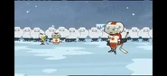 - When Betty kicks a pile of fire rocks to the bridge, then burns and breaks while the abominable snow monsters fall off.